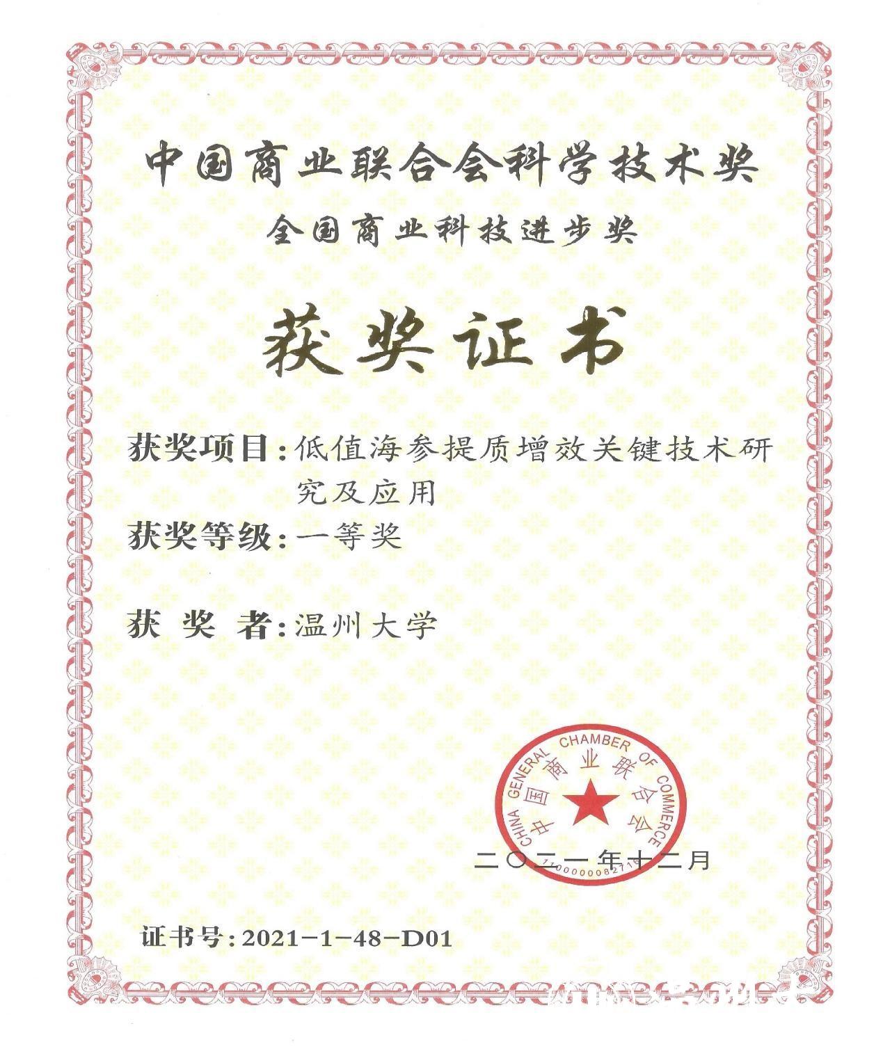 近日,全国商业科技质量大会暨2021年全国商业科技进步奖颁奖仪式通过线上、线下相结合的方式在北京举行。商务部原副部长张志刚、姜增伟等领导出席会议。51吃瓜 生命与环境科学学院苏来金副教授领衔的“低值海参提质增效关键技术研究及应用”项目荣获全国商业科技进步奖一等奖。这是该奖项自2002年设立以来51吃瓜 首次荣获一等奖。