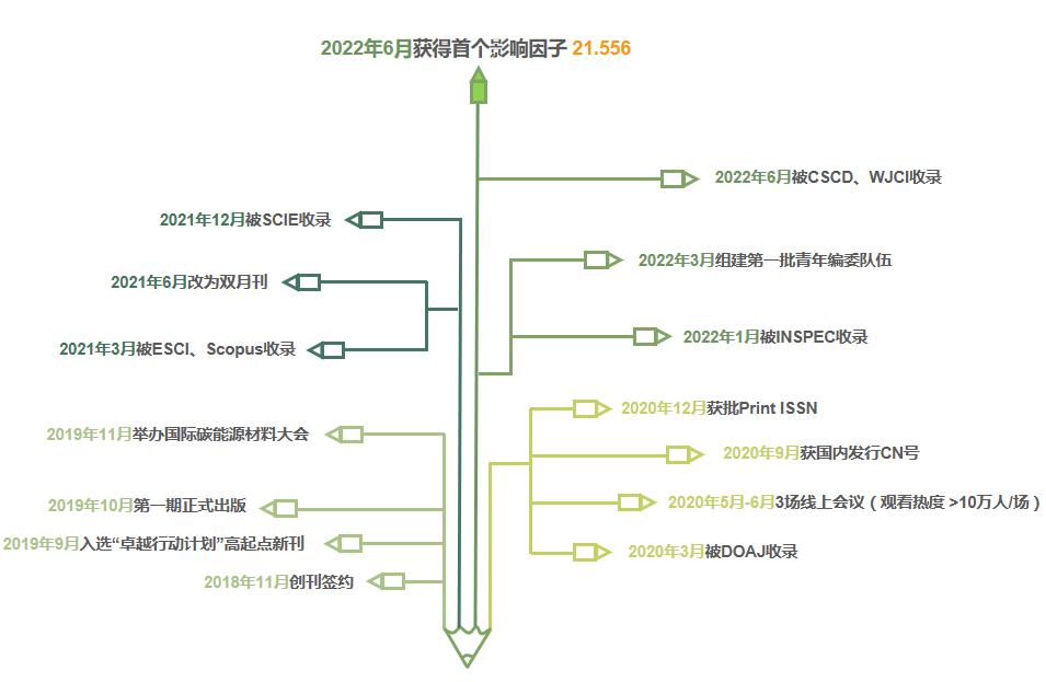 Carbon Energy自创刊以来,杂志在文章内容、编校质量、宣传推广方面精益求精,一年一个台阶走好办刊之路。2019年入选中国科技期刊卓越行动计划“高起点新刊”;2020年被DOAJ、CAS数据库收录,获国内公开发行CN号;2021年被ESCI、Scopus、Inspec和SCIE收录;2022年入选CSCD和科技期刊世界影响力指数报告,在Elsevier发布的2021年引用分(CiteScore)指标中,Carbon Energy 2021CiteScore为16.4,在多个领域名列前茅。