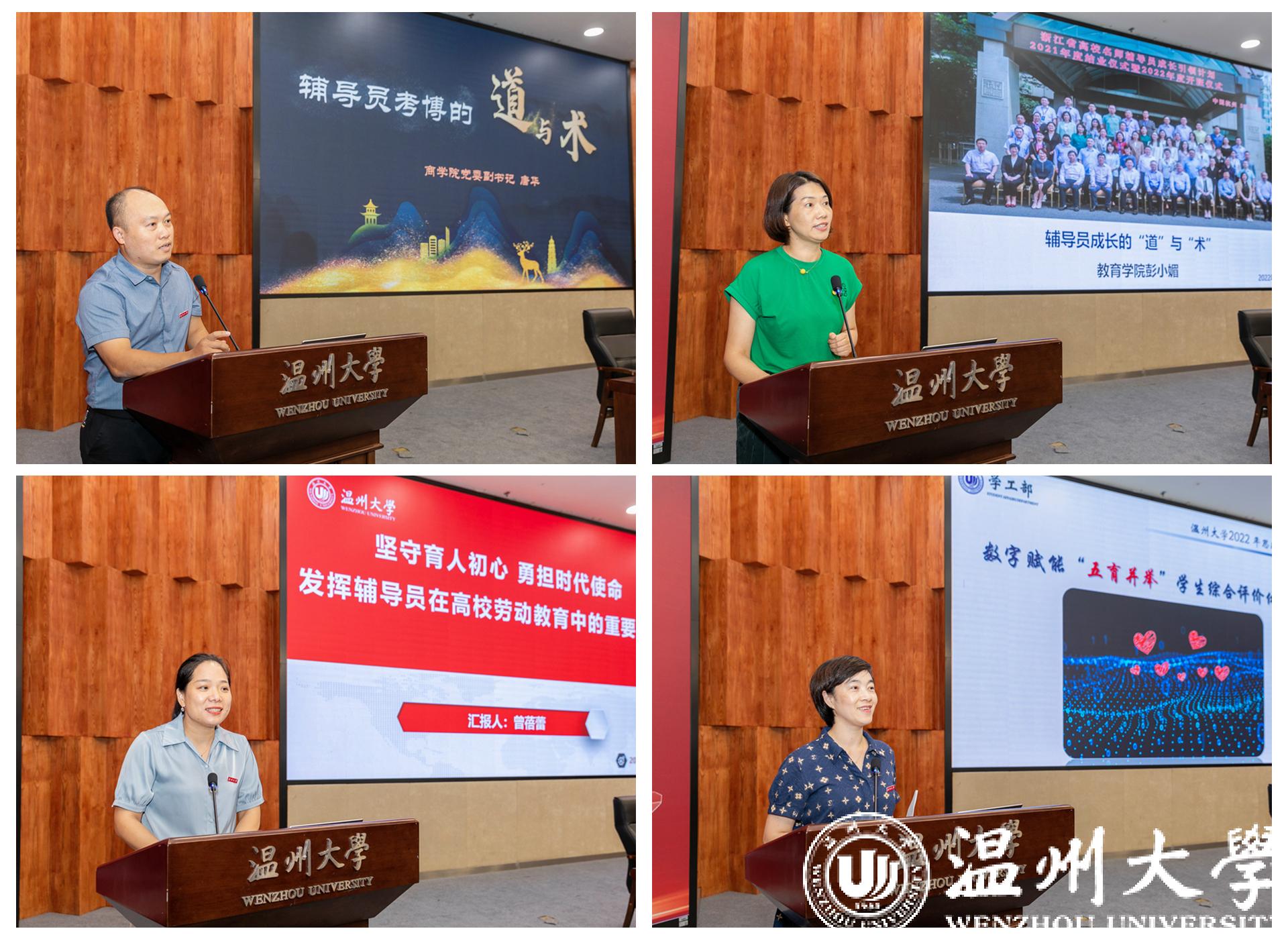会上,四位思政战线教师代表带来思政工作分享与业务培训。商学院党委副书记唐华作《辅导员考博的道与术》分享,全面剖析了自己考博的心路历程,提出了辅导员成长发展的路径思路。教育学院党委副书记彭小媚结合参加浙江省名师辅导员(二级学院副书记)成才引领计划的经历,分享了辅导员充分履职与全面发展的思考。电气与电子工程学院党委副书记曾蓓蕾结合当前学校劳动教育开展情况,鼓励辅导员要主动发挥自身在高校劳动教育中的重要作用。学工部副部长吕乐以《数字赋能“五育并举” 学生综合评价体系改革》为主题,详细介绍了当前学校智慧思政的探索与实践。