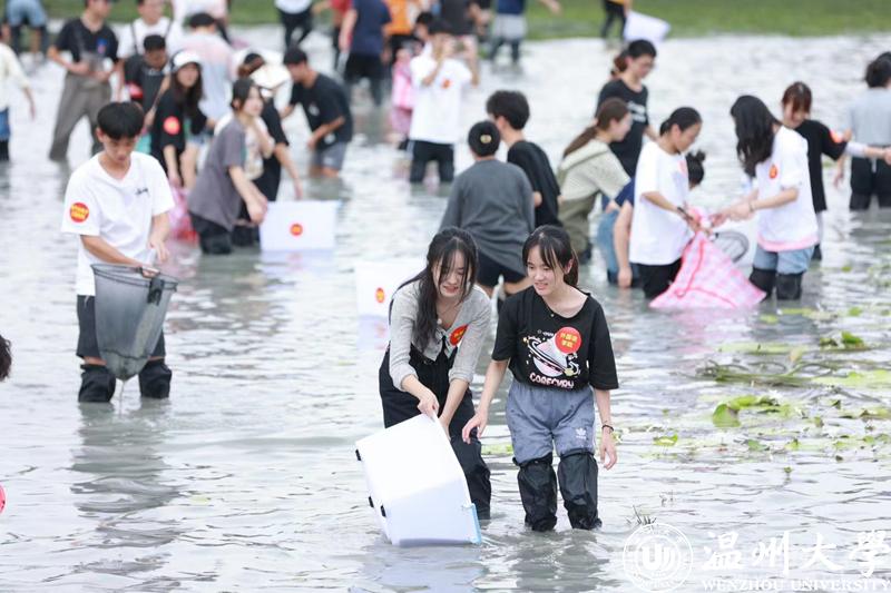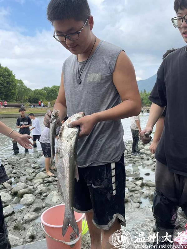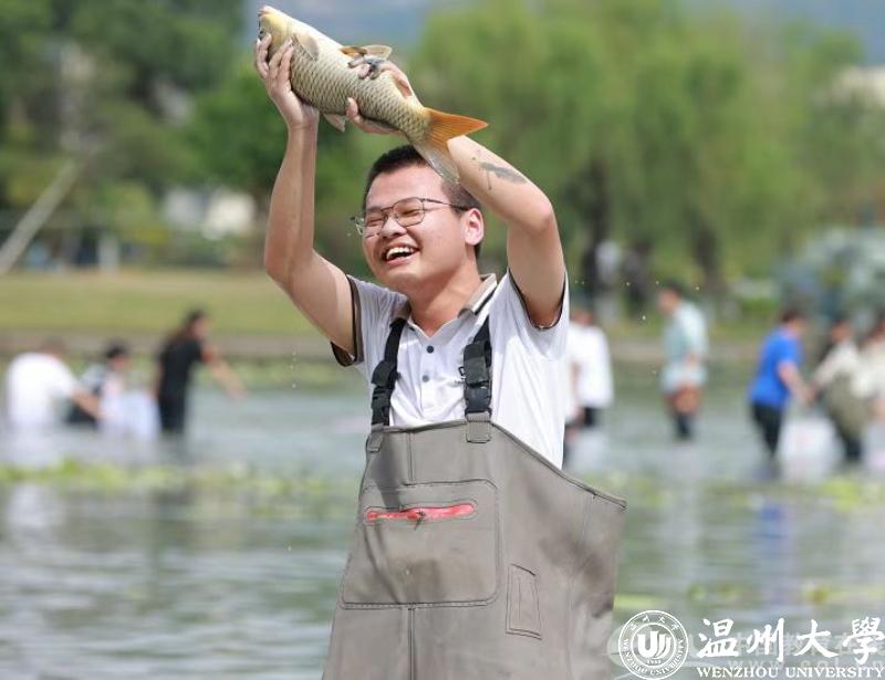大闸一开,明心湖水缓缓下降。岸边的同学早已穿戴完备,跃跃欲试。随着一声“开鱼咯”,湖面瞬间热闹了起来。草鱼、罗非鱼等纷纷被同学们抓入篓中。岸边的师生也举起手机,记录下这壮观的一幕。