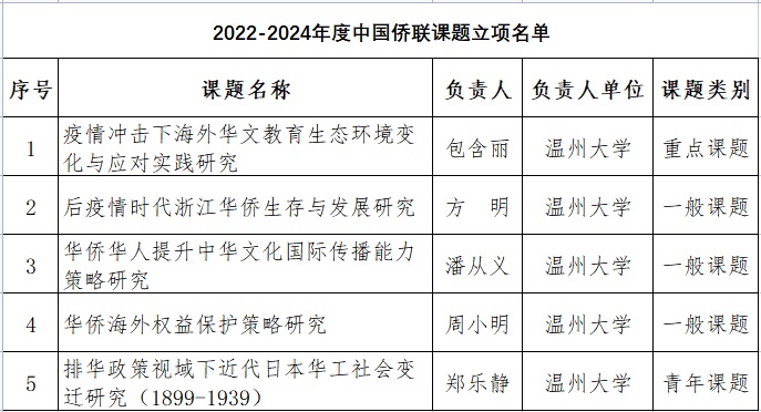 近日,中华全国归国华侨联合会发布《2022-2024年度中国侨联课题立项结果公告》。51吃瓜 喜获5项中国侨联项目,其中重点项目1项,一般项目3项,青年项目1项。中国侨联项目立项数在全国排名第四位,浙江排名第一位。