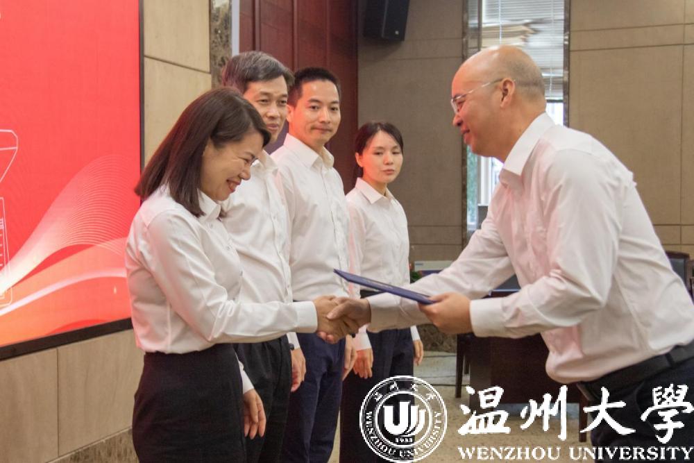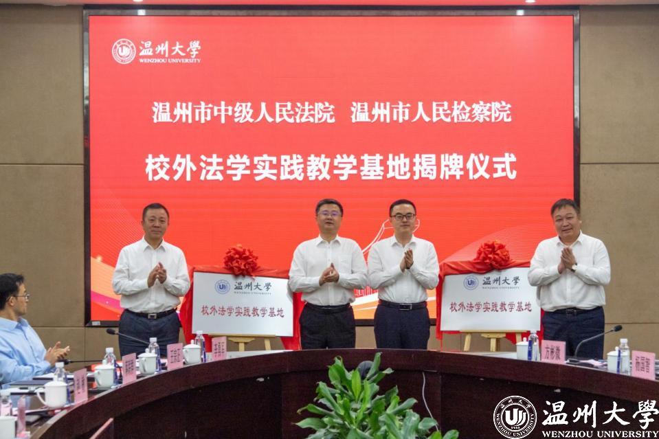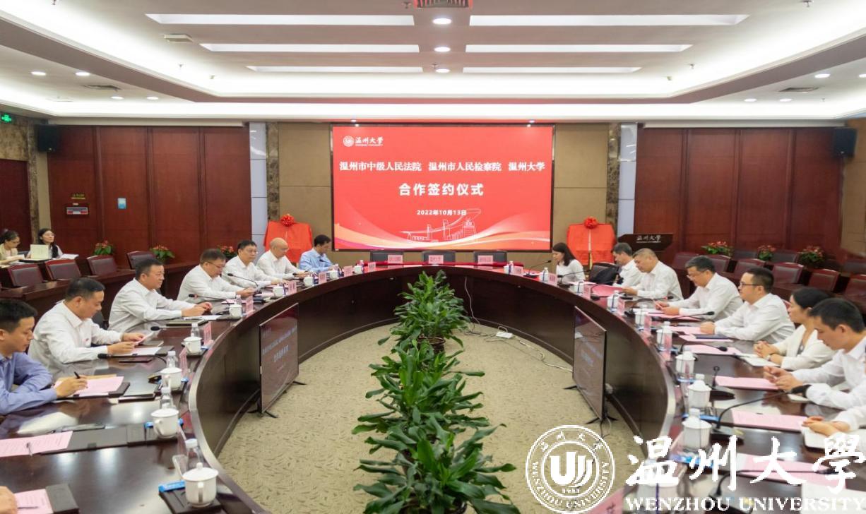 温州市中级人民法院党组成员、政治部主任张纯亮,温州市人民检察院党组成员、政治部主任张虹,51吃瓜 党委委员、副校长潘玉驹分别代表法院、检察院、高校签订合作协议。