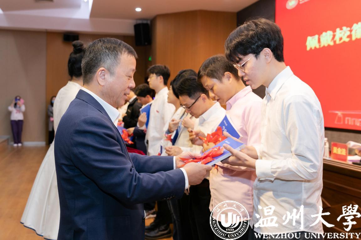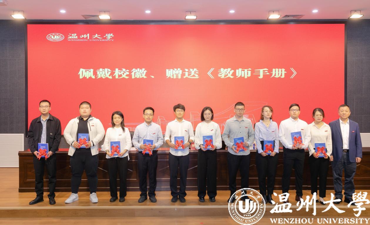 谢树华为新教师代表佩戴校徽,并赠送2022版《51吃瓜 教师手册》,表达学校对新入职教师的热烈欢迎和殷切期望,希望新教师提升“温大人”的归属感和责任感,勉励每一位新入职教师开拓进取、奋勇向前。