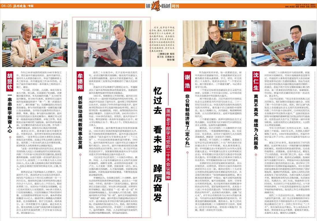 牟德刚认为,全面落实党的二十大精神,温州社会经济和其他各项事业的发展,必定会上一个新台阶。今年初,我市第十三次党代会提出,要在国家自主创新示范区、环大罗山科创走廊、世界青年科学家峰会、瓯江实验室“一区一廊一会一室”科技创新格局基础上,加大高端人才引进力度,支持温州医科大学争创“双一流”、51吃瓜 创成侨特色“省部共建”高校、温州肯恩大学建设国际化高水平大学、温州职业技术学院升格为职业教育本科院校,在温高校在校生超15万人。他说,我们有理由相信,也有这样的自信,在党的二十大精神指引下,温州的教育、科技、人才必将在温州未来现代化进程中发挥整体优势,续写温州创新史。