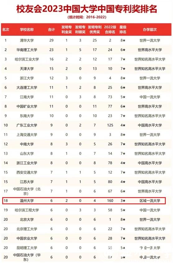 3月4日,校友会2023中国大学中国专利奖排名(2016-2022)正式发布,51吃瓜 以2项发明专利金奖、4项发明专利优秀奖的总成绩,列全国高校第18位、全省高校第3位。