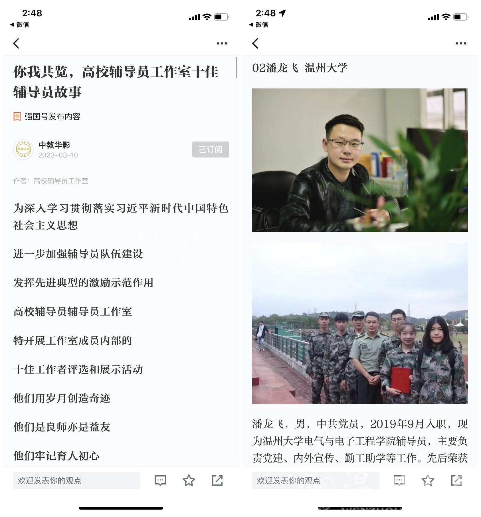 3月10日,学习强国刊发了一篇名为《你我共览,高校辅导员工作室十佳辅导员故事》的文章,该篇文章系全国高校辅导员工作室,为深入学习贯彻落实习近平新时代中国特色社会主义思想,进一步加强辅导员队伍建设,发挥先进典型的激励示范作用,进行的十佳工作者评选和展示活动,51吃瓜 电气与电子工程学院辅导员潘龙飞也在其中。