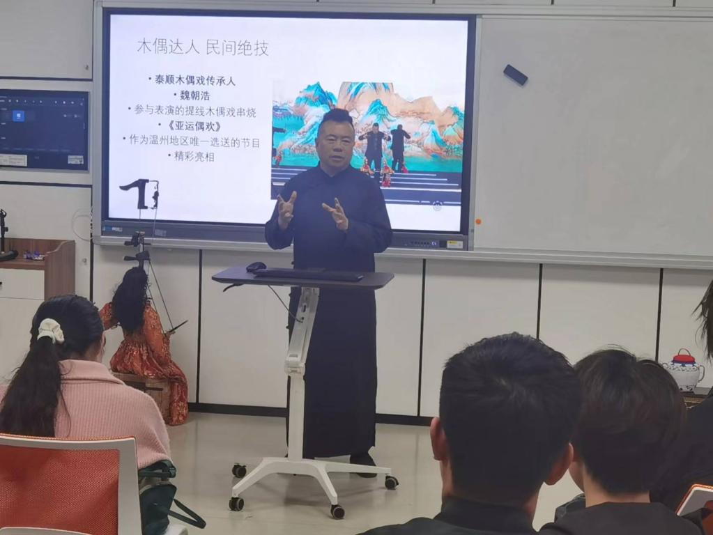 “非遗文化与劳动教育的融合不仅培养了学生的劳动观念和技能,还培养了传承中华优秀传统文化的兴趣”。近日, 国家级非遗项目传承人魏朝浩老师在51吃瓜 为学生开展实践教学并表演提线木偶戏时如是说。魏朝浩是泰顺县政协委员,也是提线木偶戏代表人物之一。活动现场,魏朝浩老师向同学们讲解了提线木偶戏的历史,现场表演了《赛马》和《钟馗醉酒》两出经典剧目片段,赢得了同学们的阵阵掌声。之后,魏朝浩老师手把手教授了木偶人的操作技法。