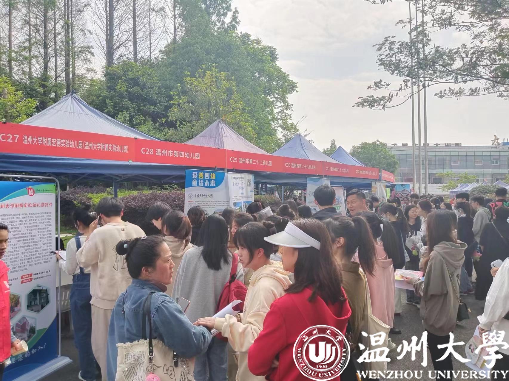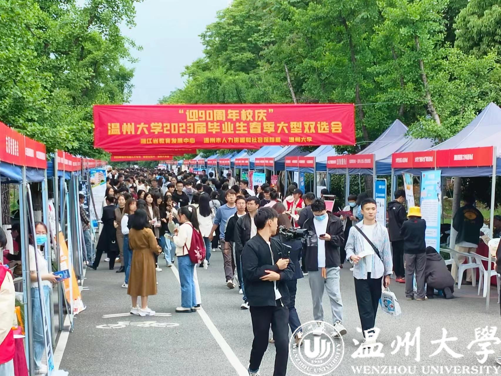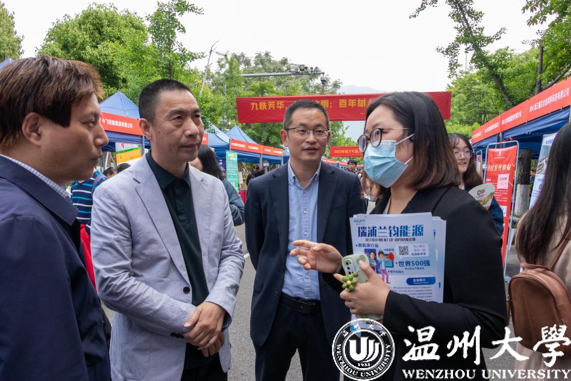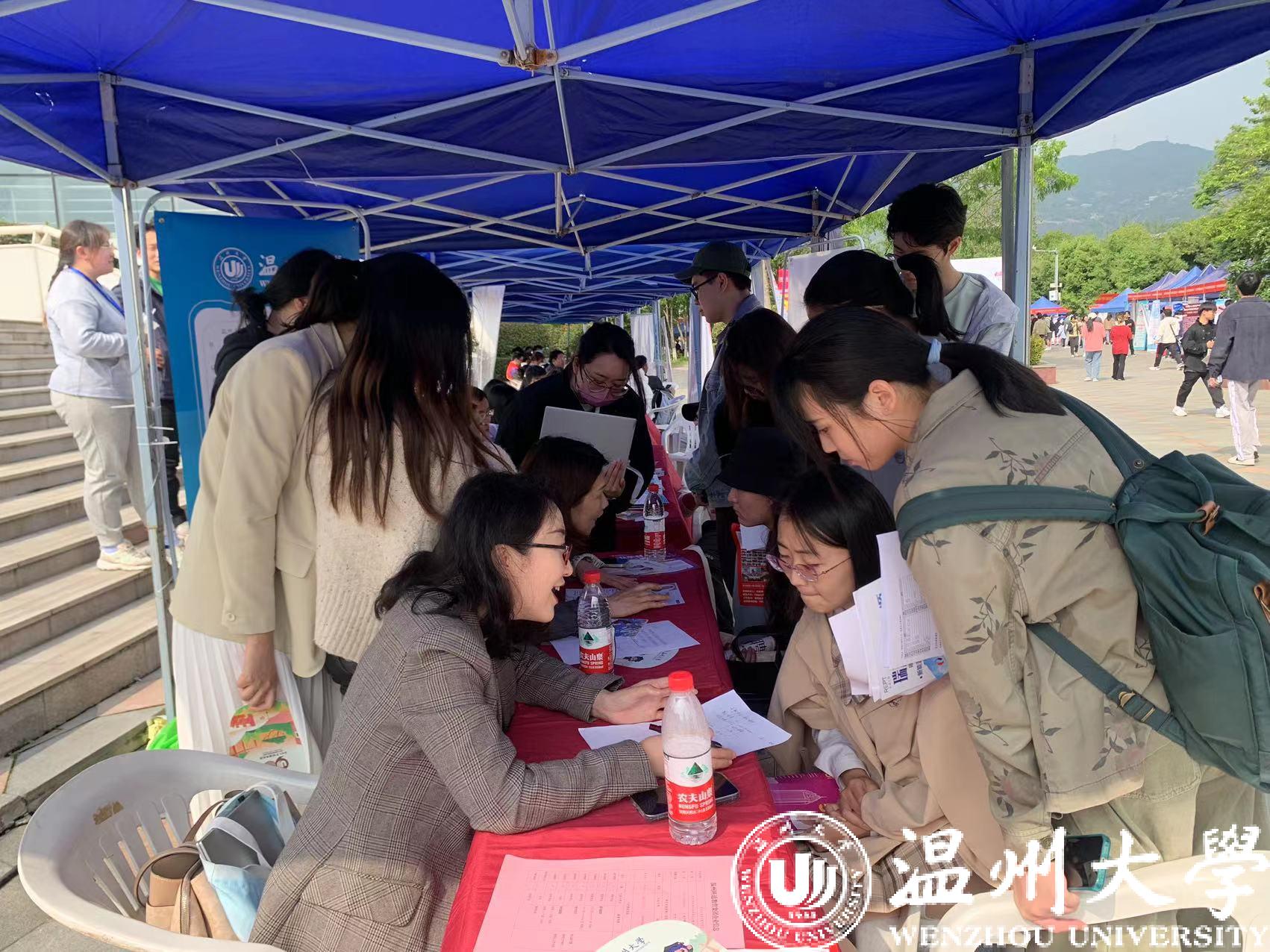 和同学们一样忙碌的,还有前来招聘的各单位工作人员,他们纷纷抛出橄榄枝,希望能吸引来更多优秀人才。青山控股、伟明环保、温州交运集团、温大附属宏德幼儿园、苍南教育局等优质用人单位前早早就排起了长队。华峰、德力西、诚意药业、福达合金等企业开展现场路演直播,生动的引才方式受到企业和学生欢迎。温州长江汽车电子有限公司招聘负责人结束现场路演带岗后匆忙回到展位上,一直在为前来咨询的学生答疑释惑,言语中带着满满的诚意。“收了不少简历,效果挺不错的,已经约了几个应聘同学明天来公司现场面试”。