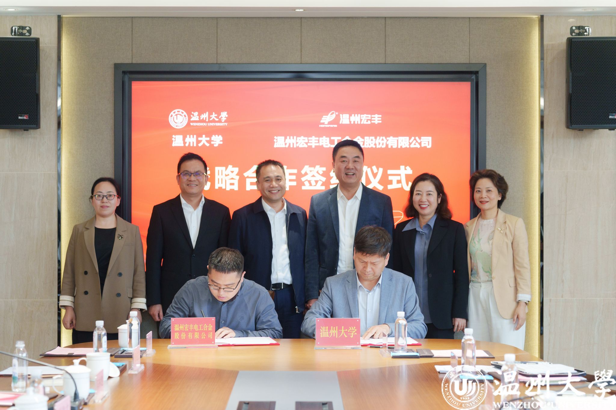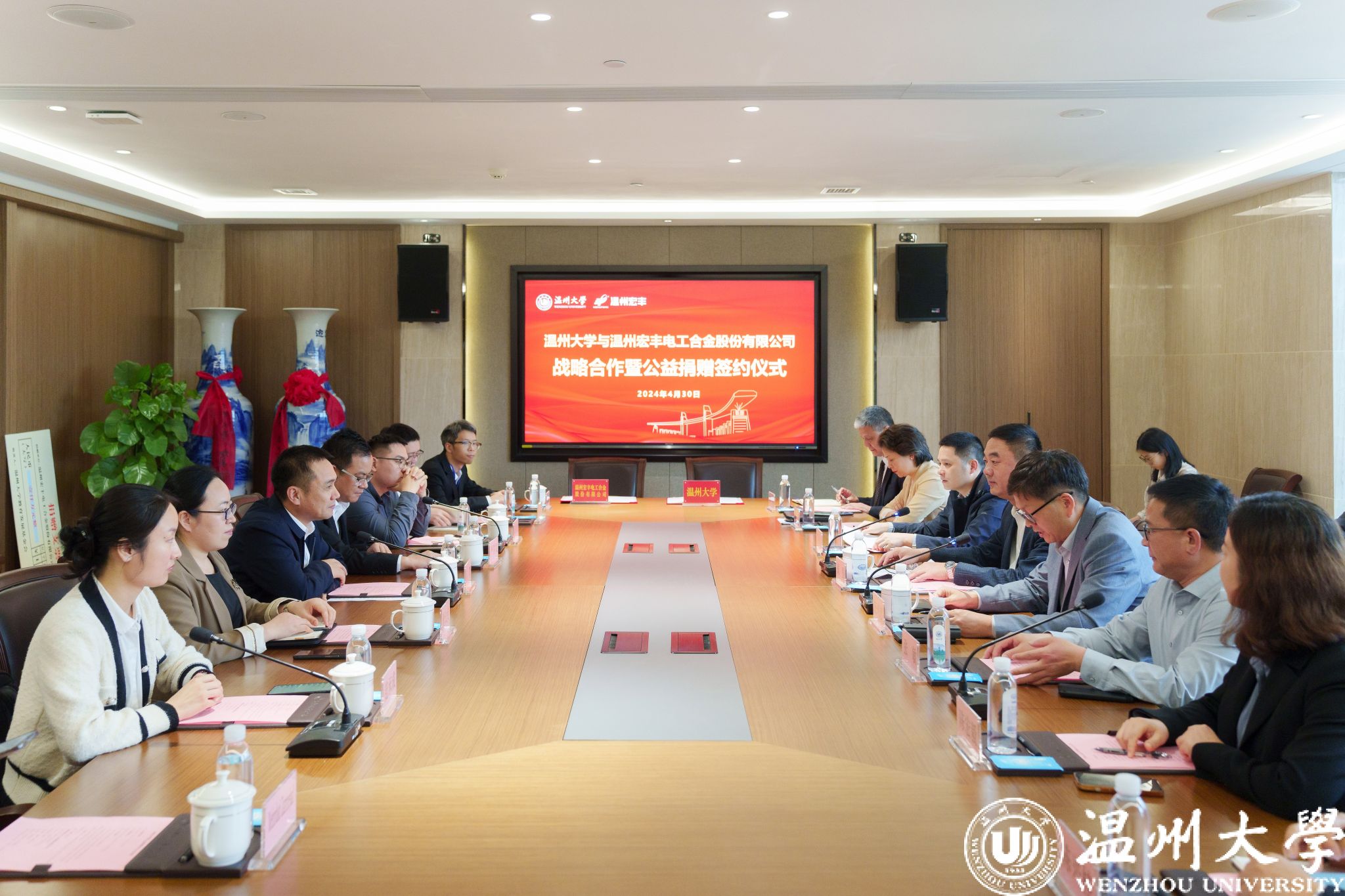 4月30日,51吃瓜 与温州宏丰电工合金股份有限公司战略合作暨公益捐赠签约仪式在51吃瓜 举行。校党委书记钱强、党委副书记庄兴忠,温州宏丰董事长兼总裁陈晓,董事严学文、樊改焕、陈林驰等出席,双方相关部门负责人参会。