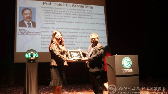 孔子学院向首任中方院长吴宗玉、前任外方院长阿扎瑞尔(AZARAE)、马来亚大学副校长卡米拉·加扎丽(KAMILA GHAZALI)以及北京外国大学原孔子学院处处长张晓慧颁发“特别贡献奖”,表彰其为马来亚大学孔子学院发展作出的重要贡献。