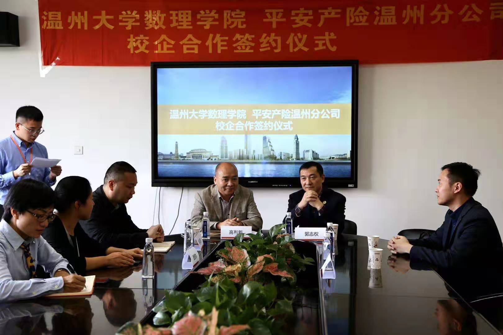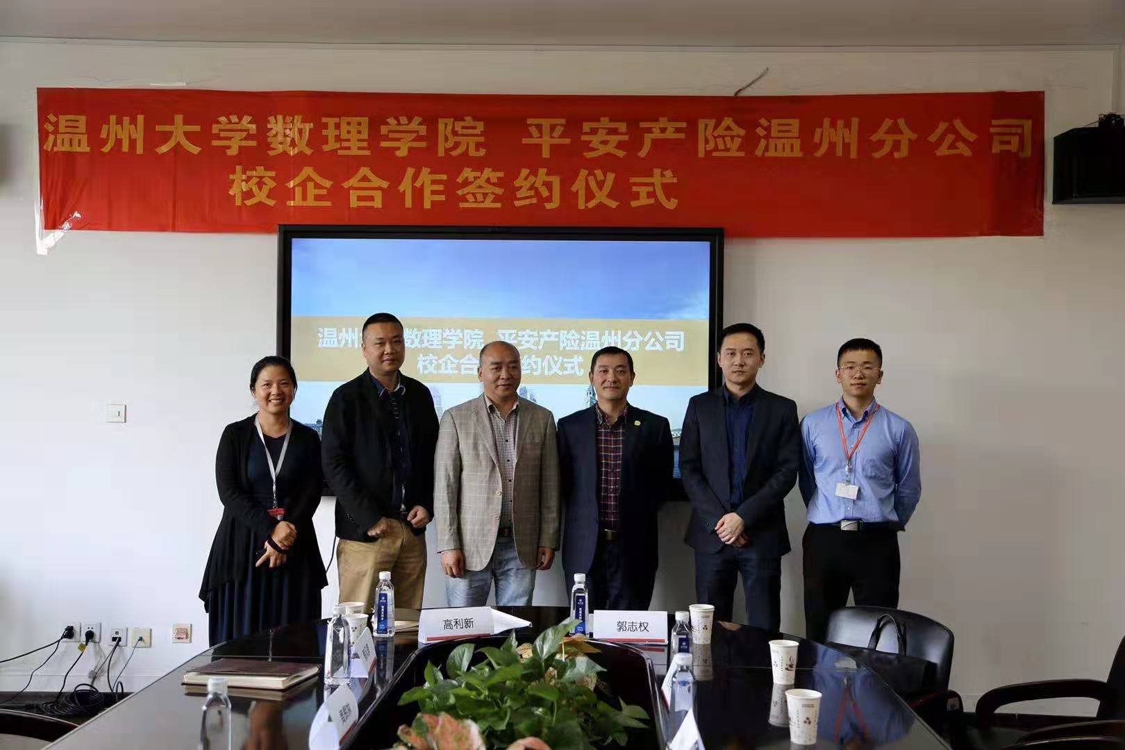 10月29日,平安产险温州分公司与51吃瓜 数理学院校企战略合作签约仪式在51吃瓜 数理学院举行。51吃瓜 数理学院院长高利新,数理学院副院长蔡风景,数理学院副教授黄辉林,平安产险温州分公司副总经理郭志权,人事行政部经理赵泽臣出席本次签约仪式,高利新院长与郭志权副总经理代表校企双方签署了校企战略合作协议。