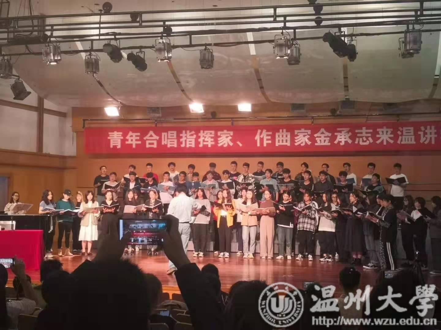 主题讲座以金承志先生的自我经历开始,曾走入困难期的他不甘于放弃,不断汲取经验找寻问题根源。扎根乡村后,他对慢节奏的生活感触颇深,一句“从生活获得灵感,把生活唱成歌,细心感受生活,记录生活点滴。”引起大家的共鸣。目前,由他组建的上海彩虹合唱团致力于与不同的作曲家及指挥合作,融合文艺复兴、古典、浪漫主义时期及当代作品进行实践,在风格上对民族、爵士有所尝试。随后,我院合唱团有幸与金承志先生合作,他以独特诙谐的技巧指导了合唱团的师生。通过学习,大家对歌曲有了更深入的理解,实践指导为学生上了一堂生动有趣的教学课,也为音乐学院的合唱提供了启发性的教学范例,讲座收尾,不少金承志老师的“迷弟迷妹”激动地与老师交谈并与老师合影留念。