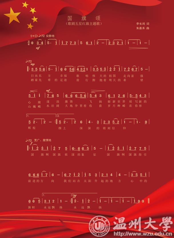 原创歌剧《五星红旗》将于10月7日、8日在温州大剧院公演。剧情围绕中华人民共和国国旗设计者——温州瑞安人曾联松先生投身革命后发生的一系列事件,挖掘其设计国旗背后的故事情节,描绘温州人民在中国共产党的领导下,为争取民族独立、人民解放而书写的壮丽篇章,歌颂中华儿女勇于担当、矢志不渝的革命精神与家国情怀。