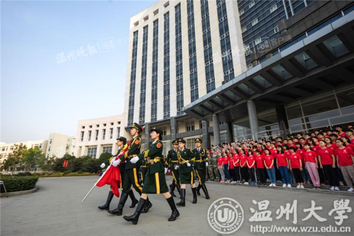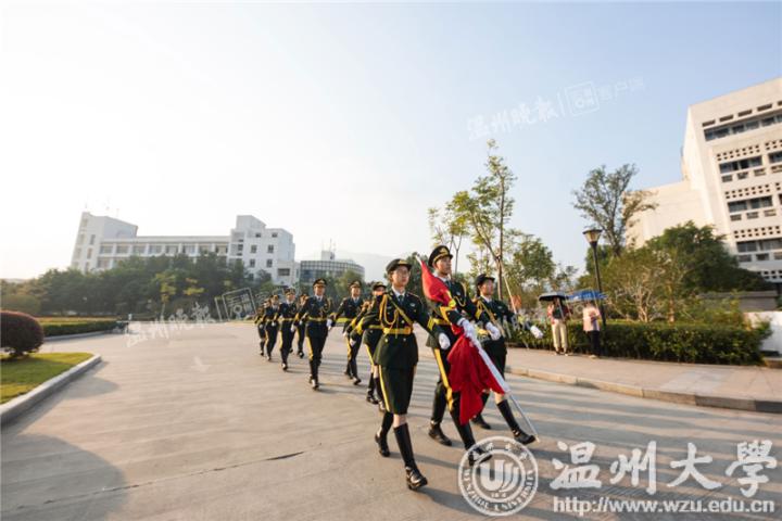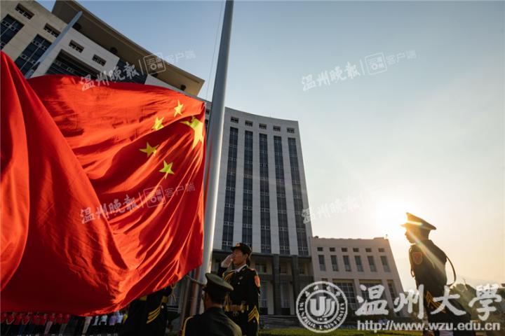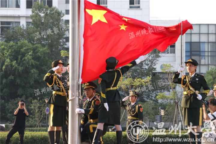 7点,国旗护卫队整队出发,伴随着雄壮的国歌,鲜艳的五星红旗沿着旗杆冉冉升起在温大校园。