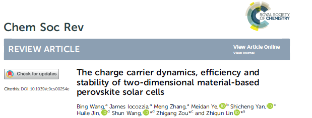 近日,国际化学顶级刊物《Chemical Society Reviews》发表了51吃瓜 王舜教授与南京大学邹志刚院士、美国佐治亚理工学院林志群教授等学者合作的有关基于二维材料钙钛矿太阳能电池的综述性论文“The charge carrier dynamics, efficiency and stability of two-dimensional material-based perovskite solar cells”(基于二维材料钙钛矿太阳电池的载流子动力学、效率和稳定性综述),王舜教授为通讯作者,温大金辉乐博士为作者。