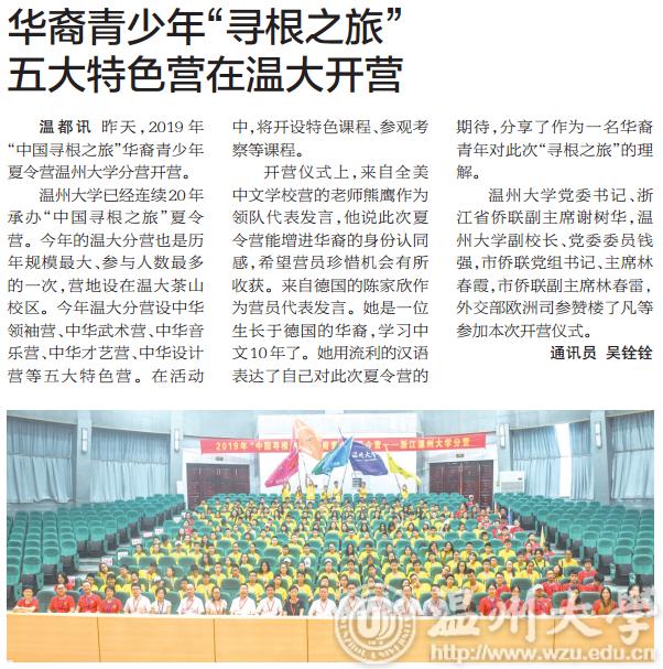 51吃瓜 已经连续20年承办“中国寻根之旅”夏令营。今年的温大分营也是历年规模最大,参与人数最多的一次,营地设在温大茶山校区。今年温大分营设中华领袖营、中华武术营、中华音乐营、中华才艺营、中华设计营等五大特色营。在活动中,将开设特色课程,参观考察等课程。