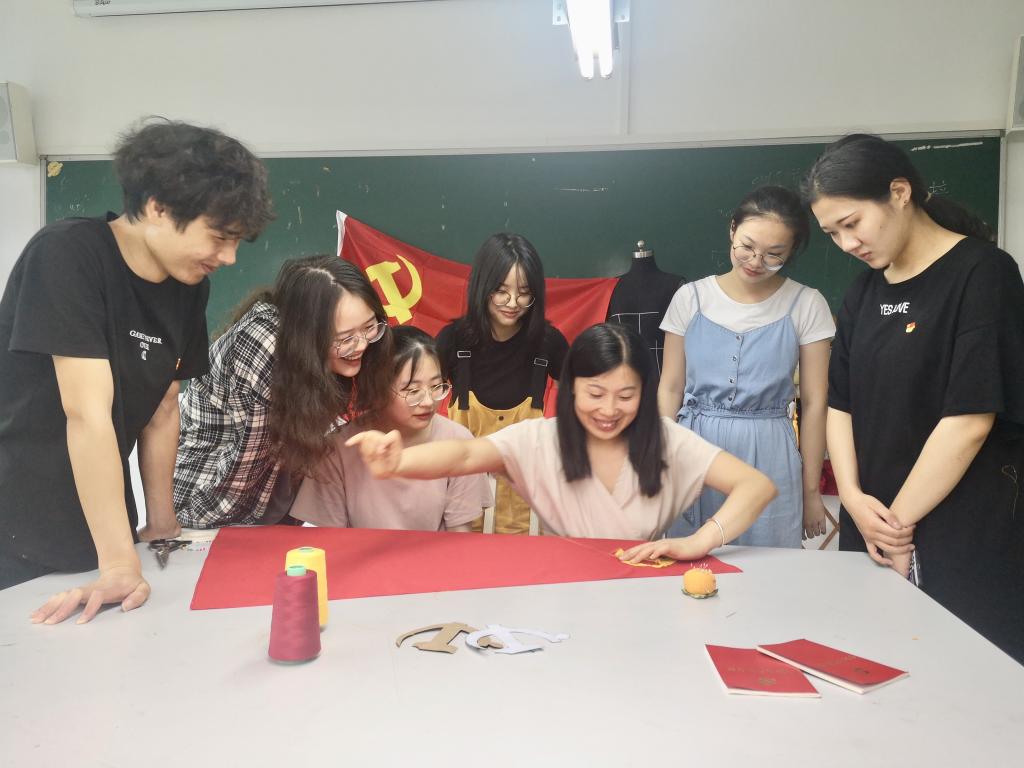 烫布,画样,剪裁,叩烫,暗撬,包边,一环扣着一环。在鲜红色、正黄色的映衬下,师生们脸上都不由地浮出一种敬重感,这是对党的敬意之情,彰显了师生们对党的热爱。