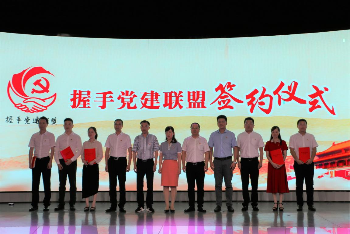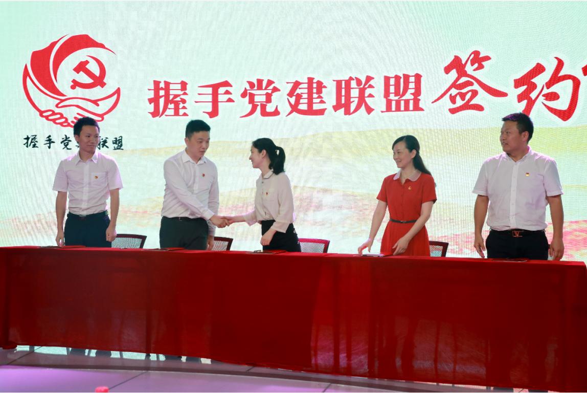 6月28日,“握手”党建联盟启动仪式在浙南科技城举行,51吃瓜 美术与设计学院党委同温州市龙湾区委两新工委、浙南科技城机关党委、蒲州街道党工委、瑶溪街道党工委等5家“握手”党建联盟的成员进行签约仪式,并宣读了联盟公约、发布了服务项目清单。
