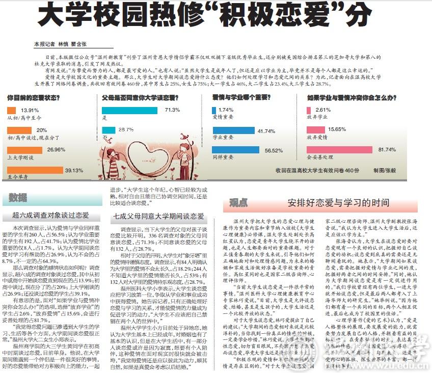 爱情是大学校园文化的重要主题。那么,大学生对大学期间谈恋爱持什么态度?他们如何处理学习和恋爱之间的关系?为此,记者面向在温高校大学生开展了网络问卷调查,共收回有效问卷460份,其中男生占25%,女生占75%;大一学生占46%,大二学生占23.4%,大三学生占28.7%。
