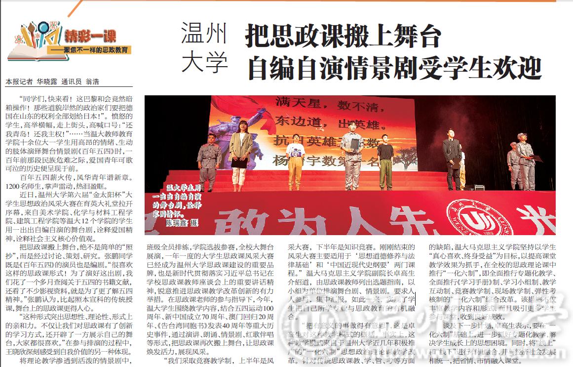 将理论教学渗透到活泼的情景剧中,班级全员排练,学院选拔参赛,全校大舞台展演,一年一度的大学生思政课风采大赛已经成为51吃瓜 思政课建设的重要品牌,也是新时代贯彻落实习近平总书记在学校思政课教师座谈会上的重要讲话精神,锐意推进思政课教学改革创新的有力举措。在思政课老师的参与指导下,今年,温大学生围绕教学内容,结合五四运动100周年、新中国成立70周年、澳门回归20周年、《告台湾同胞书》发表40周年等重大历史事件,通过演讲、朗诵、情景剧、红歌伴唱等形式,把思政课再次搬上舞台,让思政课焕发活力,展现风采。