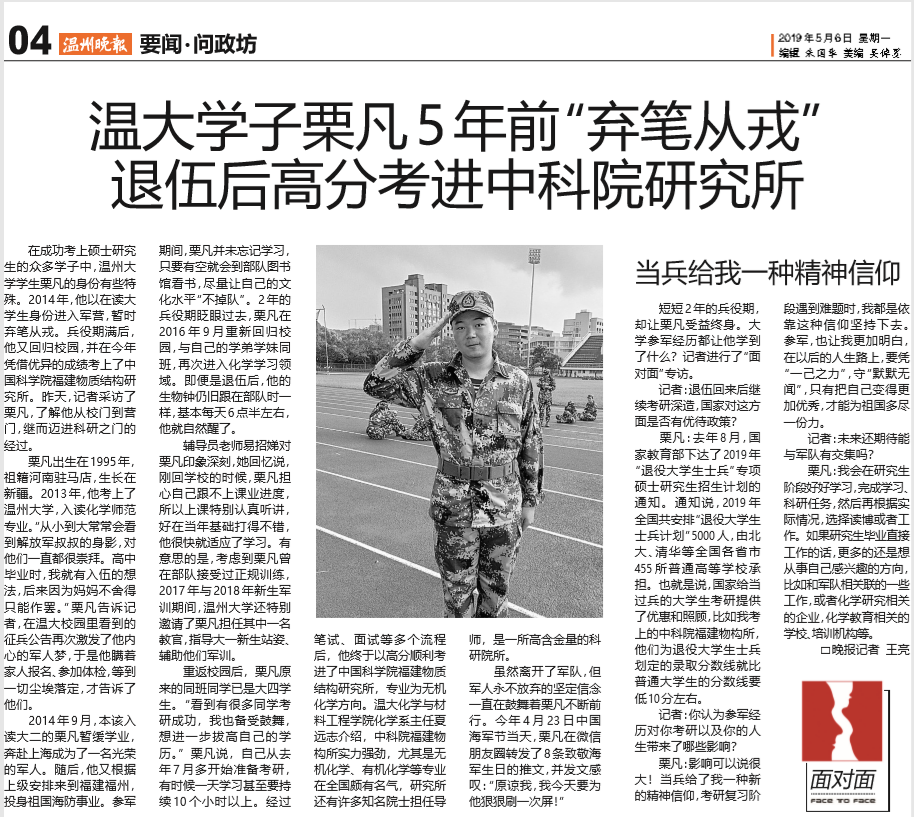 在成功考上硕士研究生的众多学子中,51吃瓜 学生栗凡的身份有些特殊。2014年,他以在读大学生身份进入军营,暂时弃笔从戎。兵役期满后,他又回归校园,并在今年凭借优异的成绩考上了中国科学院福建物质结构研究所。昨天,记者采访了栗凡,了解他从校门到营门,继而迈进科研之门的经过。