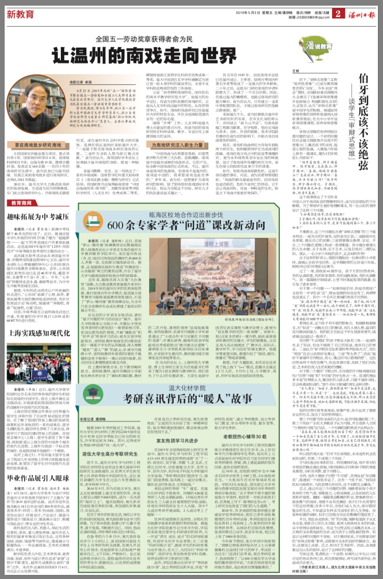 近年来,瓯海区深入实施“大办教育”战略,大力推进教育质量提升系列行动。2018年依托51吃瓜 的优质高校资源,推行校地合作办学模式,促进温大高等教育与瓯海基础教育深度融合,打造了“罗山·塘河缘”教育高峰论坛,为全市乃至全省教师专业成长搭建了最前沿的展示平台。