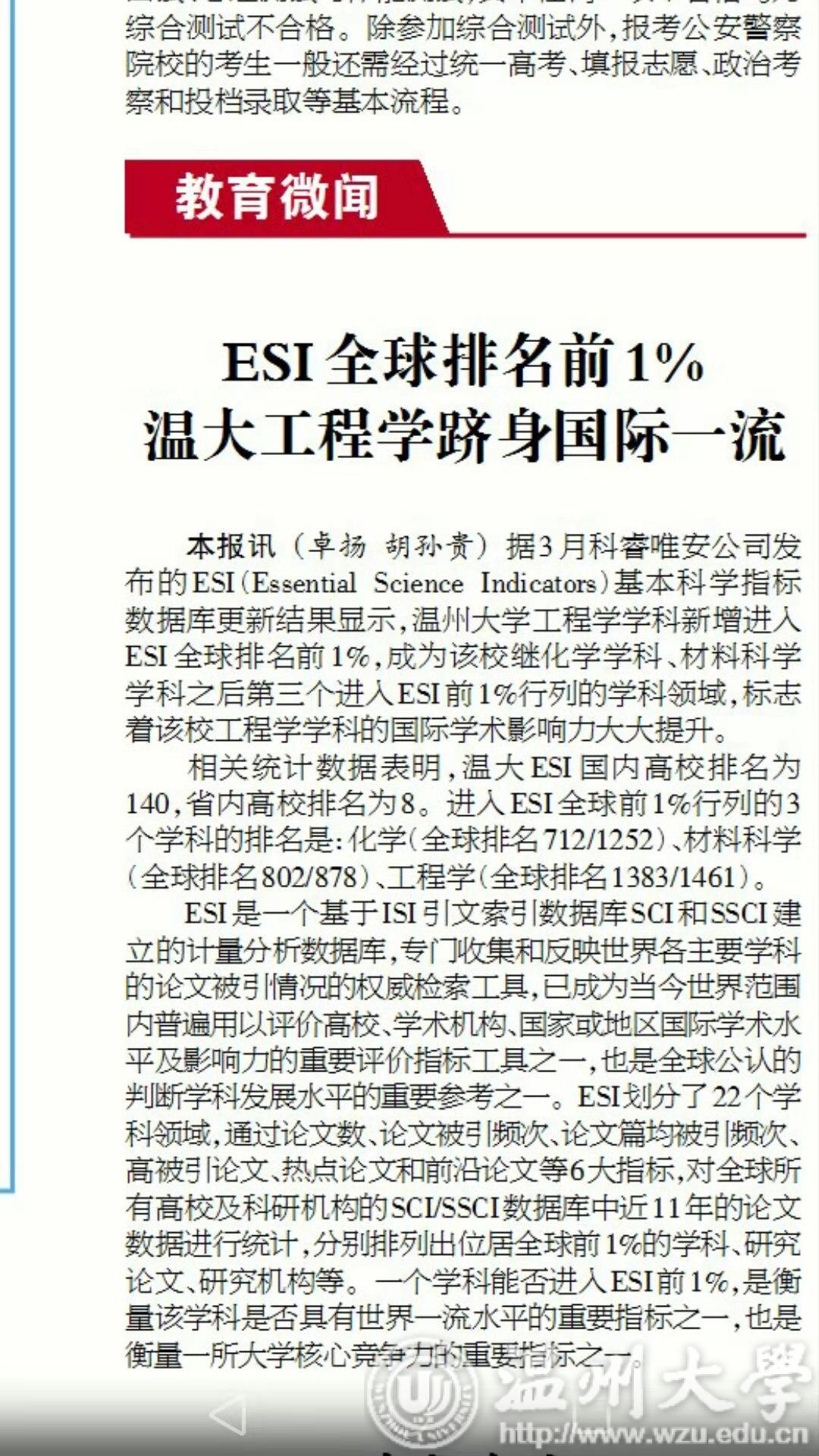 相关统计数据表明,温大ESI国内高校排名为140,省内高校排名为8。进入ESI全球前1%行列的3个学科的排名是:化学(全球排名为712/1252)、材料科学(全球排名为802/878)、工程学(全球排名为1383/1461)。