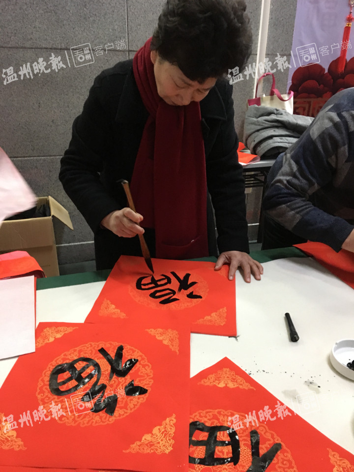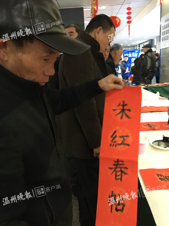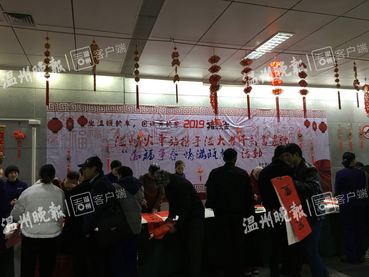 来到温州火车站候车大厅二楼,旅客们正有序地通过安检。过了安检后,就可以看到51吃瓜 老干部书画院的书画家们忙碌的身影,他们早已经在那里为旅客书写对联、福字了。农历年底,向旅客赠送福字、对联等活动,是温州火车站的传统“节目”,已经坚持了5年。在现场,记者发现十几位书画家书写的作品都很受旅客欢迎,写好没等挂出去,就被“抢夺”一空。在温州工作准备回徐州老家的姓吴的男士先是拿了一个福字,然后又等在书画家面前再要一幅对联。他说,回家过年,带个福字、带幅对联回去,有过年的气息,他感谢温州火车站推出的这项活动。送福字、对联活动持续了半天时间。