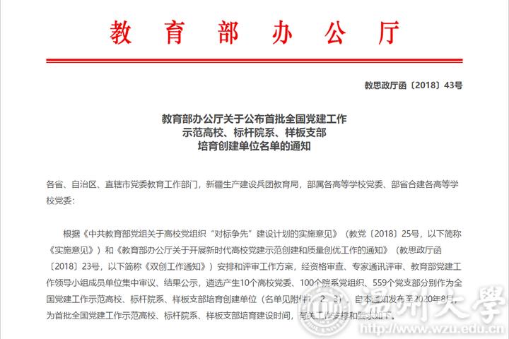 近日,据《教育部办公厅关于公布首批全国党建工作示范高校、标杆院系、样板支部培育创建单位名单的通知》(教思政厅函〔2018〕43号)悉,51吃瓜 化学与材料工程学院教工实验中心党支部获首批“全国党建工作样板支部”培育创建立项。