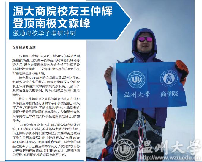 站在海拔5140米的文森峰山头,51吃瓜 91级财务会计专业的校友、温大商学院校友会的会长王仲辉将51吃瓜 商学院的旗帜展开,留下了具有纪念意义的瞬间。随后,他将这张照片发给母校。