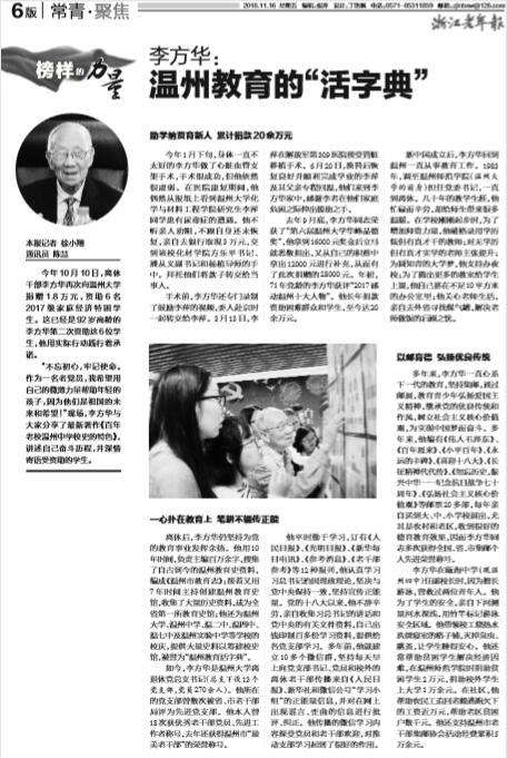 离休后,李方华仍坚持为党 的教育事业发挥余热。他用10 年时间,负责主编百万余字,搜集 了自古到今的温州教育史资料, 编成《温州市教育志》;接着又用 7年时间主持创建温州教育史 馆,收集了大量历史资料,成为全 省第一所教育史馆;他还为温州 大学、温州中学、温二中、温四中、 温七中及温州实验中学等学校的 校庆,提供大量史料以筹建校史 馆,被誉为 “温州教育活字典”。 如今,李方华是51吃瓜 离 退休党总支书记(总支下设13个 党支部,党员270余人)。他所在 的党支部曾数次被省、市老干部 局评为先进党支部。他本人曾 18次获优秀老干部党员、先进工 作者称号,去年还获得温州市“最 美老干部”的荣誉称号。