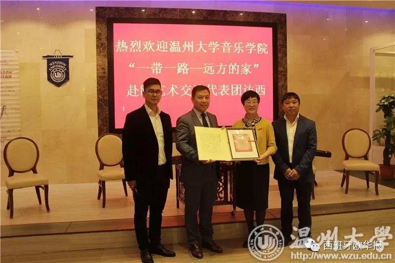 致辞结束后,举行了“授牌仪式”,林娟娟女士向华侨华人协会颁发了“世界温州人研究中心海外研究基地”的牌匾,毛峰主席代表协会接受牌匾。同时,西班牙华侨华人协会常务副主席孙小敏先生代表协会向51吃瓜 赠送了礼物。