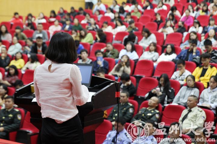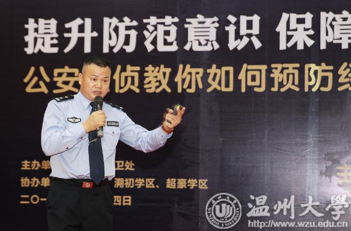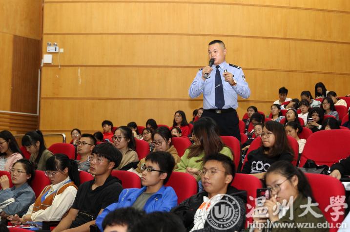 瓯海公安分局经侦大队教导员金定忠给温大的学生们讲课