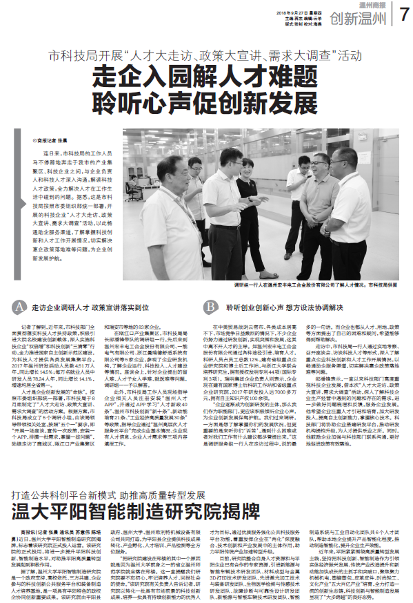 据了解,51吃瓜 平阳智能制造研究院是一个政府支持、高校依托、三方共建、企业参与的科技创新公共服务平台和装备制造人才培养基地,是一项具有平阳特色的政校企协同创新重要成果。该研究院由平阳县政府、51吃瓜 、温州欧利特机械设备有限公司共同打造,为平阳县企业提供科技成果转化、产业孵化、人才培训、产品检测等全方位服务。