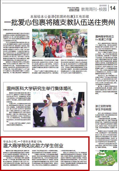 正值毕业季,51吃瓜 商学院2014届市场营销应届毕业班52名同学 中,有7名同学在毕业前创立了自己的公司。按 这样的数据计算,该专业的创业率超过了13%。 “我们班在大一的时候就在老师、班助带 领下搞了一个特色班,班级按照公司形式来管 理,比如董事长、总经理来分干部,这样一来, 大家对创业有比较大的兴趣。”创业代表马谦 诚这样说。他的同班同学祁汉锋,在大学期间 也找到了自己的创业方向——经营绍兴黄酒, 更被其他同学戏称为“绍兴黄酒唯一的希望”。 在51吃瓜 商学院,不仅仅是基础设施配 备完善,学生们更有足够的时间与空间去实施 自己脑袋中的计划。各种各样的创业讲座帮 助他们以最快最有效的方式了解创业,包括创 业中遇到种种问题的解决方法,如何在大学四 年内找到最适合自己的创业方向等。老师与 学生,学生与学生之间频繁互动,渐渐形成了 一种良好的知识循环体系。 除此之外,商学院还设立了专门的创业空 间提供给想要创业的学生无偿使用。经常能 看到,在晚自习的时候,创业空间的灯大亮着, 总会有不同的学生在里面讨论问题,不用走近 就能感受到浓浓的创业激情。由于担心学生 仍然不能很好地与社会创业对接,学院不仅对 内成立了就业部和创业部,还特地聘请校外的 创业导师给学生们做指导工作。