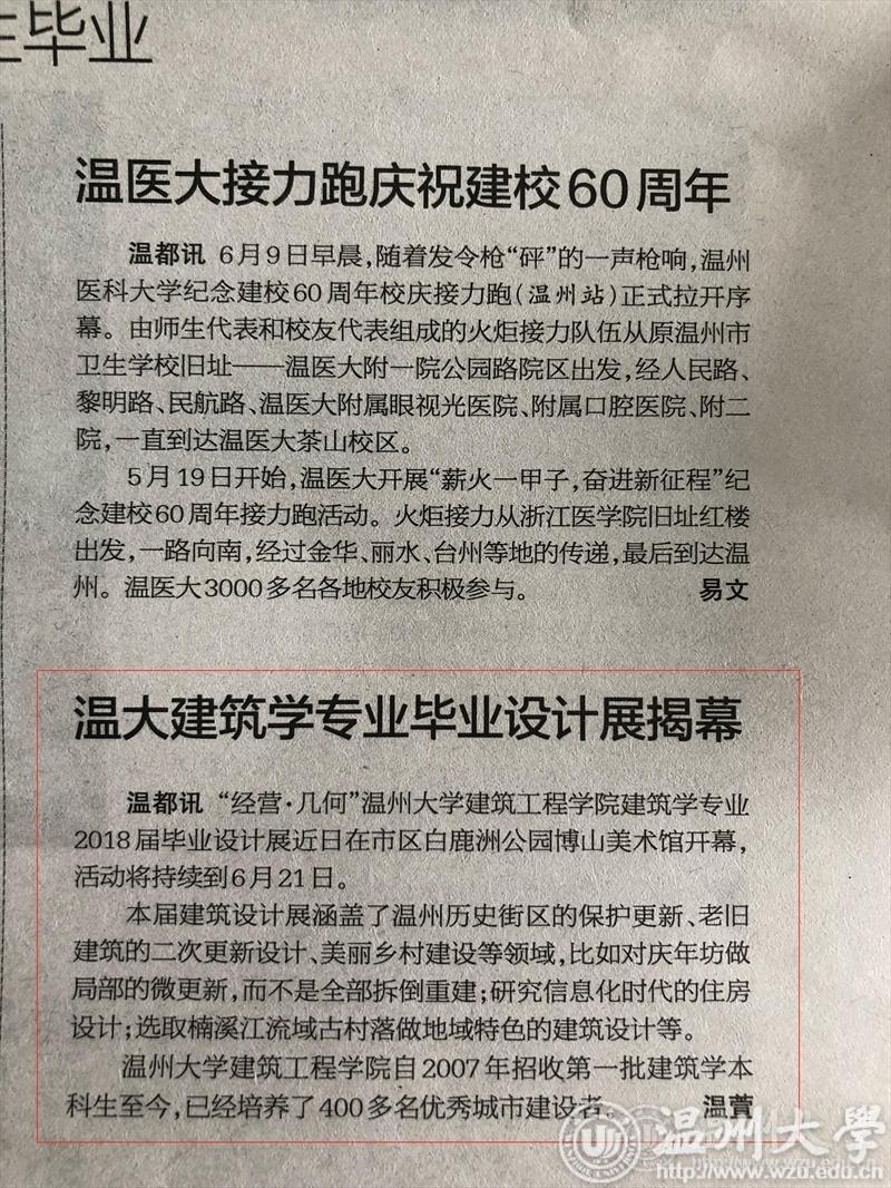 “经营几何'51吃瓜 建筑工程学院建筑学专业2018届毕业设计展近日在市区白鹿洲公园博山美术馆开幕,活动将持续到6月21日。 本届建筑设计展涵盖 了温州历 史街区的保护更新、老旧建筑的二次更新设计美丽乡村建设等领域,比如对庆年坊做局部的微更新,而不是全部拆倒重建;研究信息化时代的住房设计;选取楠溪江流域古村落做地域特色的建筑设计等。 51吃瓜 建筑工程学院自2007年招收第一批建筑学本科生至今,已经培养了400多名优秀城市建设者。