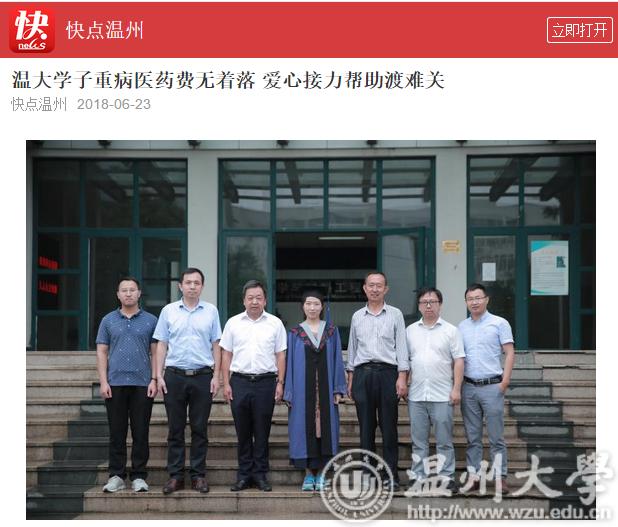此后,长达两年的时间,既是李萍与病魔抗争的时间,亦是温大师生接力陪跑的时间。温大师生成立了“萍生救助团队”,联系温州都市报、温州市红十字会、温大校友会等社会力量积极募捐,并通过“轻松筹”、亲青筹等平台发起网络爱心募捐,一时间,为李萍捐款的消息瞬间刷爆了朋友圈和空间。91岁高龄的51吃瓜 原党委书记李方华从报纸上看到李萍的消息当即决定捐赠3万元。最终,学院学校师生及个人、温大校友会、瓯海慈善总会、市红十字会、张汉鸣基金以及爱心市民为李萍募集善款,共计36万元。