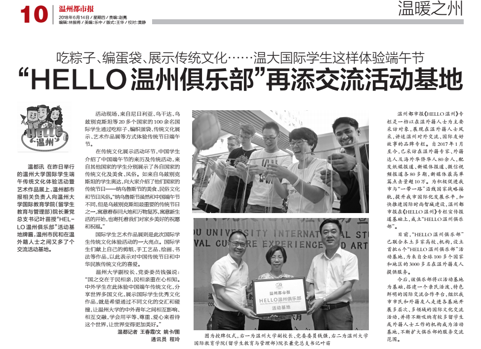 温都讯 在昨日举行的51吃瓜 国际学生端午传统文化体验活动暨艺术作品展上,温州都市报相关负责人向51吃瓜 国际教育学院(留学生教育与管理部)院长兼党总支书记叶苗授“HELLO 温州俱乐部”活动基地牌匾,温州市民和在温外籍人士之间又多了个交流活动基地。