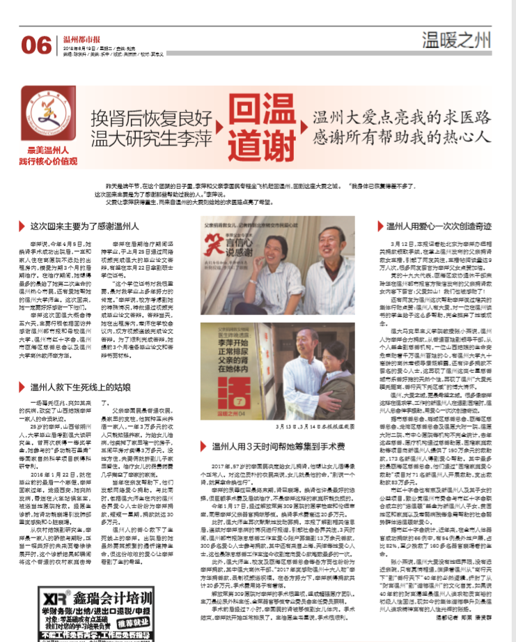 今年1月17日,经过解放军第309医院的医学检查和伦理审 查,同意李萍父亲器官捐献移植。换肾手术费高达20多万元。 此时,温大师生再次默默地发动募捐。本报了解到相关信息 后,连续对李萍患病的情况进行报道,引起社会各界关注,3天时 间,温州都市报陈忠慈善工作室爱心账户募集到13万余元善款,300多名爱心人士参与捐款,其中还有来自上海、天津等地爱心人 士,这也是陈忠慈善工作室迄今收到定向爱心款笔数最多的一次。