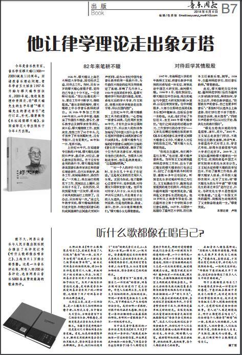上世纪40年代,在福建音专任教的3年间,缪天瑞先后教授和声学、曲式学、对位法、音乐教学法等课程。苦于没有专业用的教科书,缪天瑞选择翻译美国音乐教育家该丘斯的音乐理论著作,白天从事教学、教务工作,夜间编译教材、修改作业。“一天晚上,我在油灯的微光下工作,其间出去上厕所,回来稿子不见了。东找西找,只找到屋角里一团灰烬,原来稿子被风刮到油灯上烧掉了。没办法,只好再写一次。”通过几年教学实践,缪天瑞编译的教材逐步完善,相继出版《音乐的构成》《曲调作法》《曲式学》《和声学》等,成为20世纪中国专业音乐教育的第一批教科书,为作曲技术理论的应用及传播奠定了基础,影响了几代学人。1950年出版的《律学》,是缪天瑞将学科知识进行筛选、梳理、系统化后的学术专著,行文简洁,使艰深的律学理论走出象牙塔,得以在国内推广。