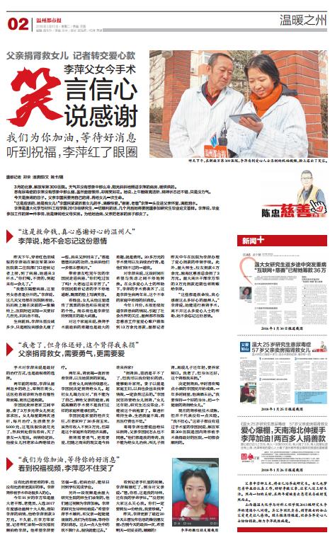 今年1月份,本报连续报道李萍患病的情况,引起了社会各界的关注,温州都市报陈忠慈善工作室爱心账户募集到13万余元善款,温都记者昨天中午在医院为李萍办理了爱心捐款的申领手续。此外,温大师生、校友捐款6万余元,瓯海区慈善总会捐了3万元。温大离休干部李方华的3万元捐款近期也将转账给李萍。