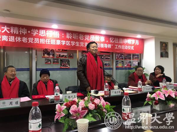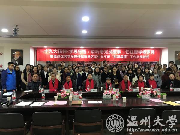 12月14日上午,离退休老党员担任超豪学区学生支部“引领导师”工作启动仪式举行,七名离退休老党员,学校有关部门、学院负责人及超豪学区全体教工党员、60余名学生党员参加仪式。仪式上,学生党员献上诗朗诵《十九大礼赞》,并为被聘为学区“引领导师”的七位离退休老党员送上鲜艳的红色围巾。窗外寒风瑟瑟,屋内温暖如春。老少党员们的心紧紧连在了一起。