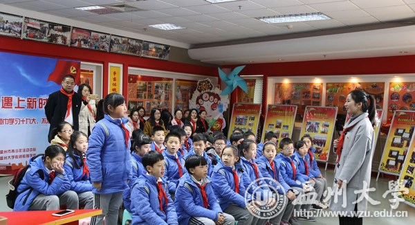 为学习贯彻“十九大”精神,让少先队员们深入了解祖国的发展,感受自身的责任,12月17日上午,由共青团温州市委、温州市少工委主办,51吃瓜 教师教育学院与温州市少先队总部长共同承办的“红领巾遇上新时代”主题活动在温州市青少年活动中心隆重举行。51吃瓜 教师教育学院党总支副书记杨丽君、青少年活动中心党支部书记暨副主任叶立东、温州市少先队总辅导员黄瑞华、知心姐姐指导老师严晓秋等出席本次活动。