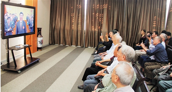 这天,乐清市委老干部局组织离休干部、县处级退休干部、活动中心及老年大学临时党小组负责人50余人集中收看党的十九大开幕直播。在习近平总书记作十九大报告的3个多小时里,老同志们认真听取报告,没有一个人离开座位。