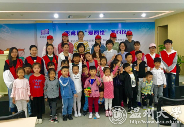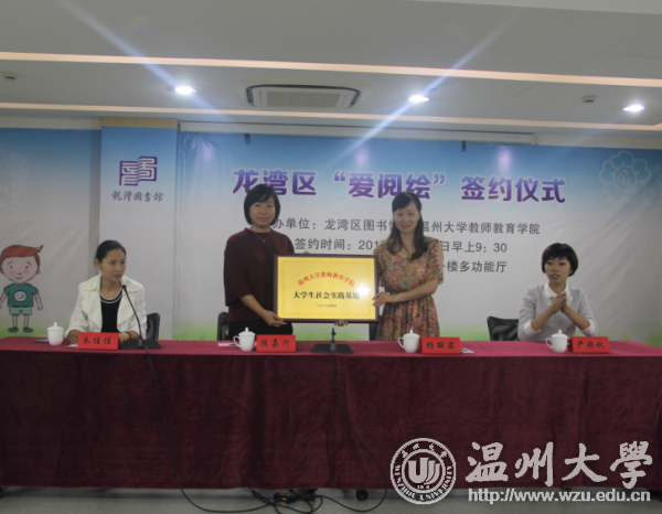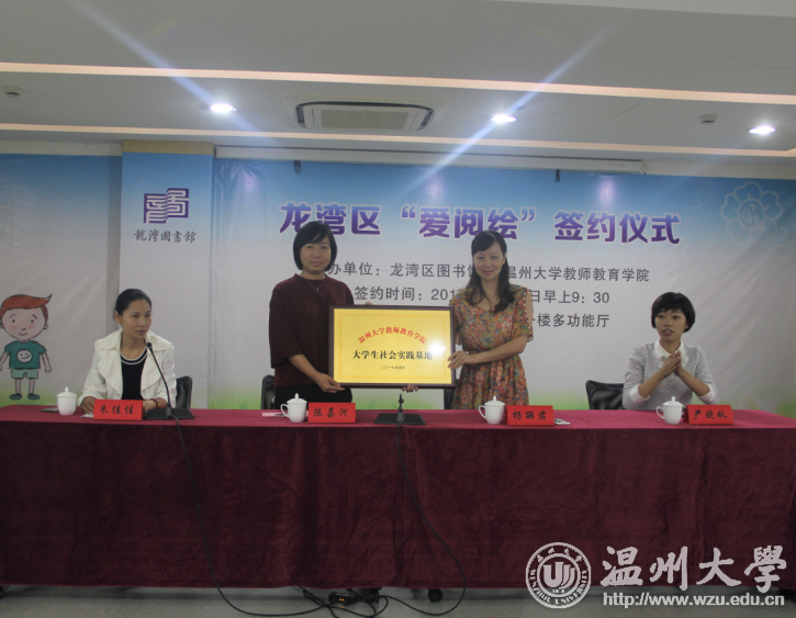 为丰富广大青少年儿童的课余生活,帮助孩子们养成爱阅读的好习惯,在动手动脑中学习成长,2017年10月14日上午,温大教师教育学院“知心姐姐”志愿服务队走进龙湾图书馆,举行“四叶草课堂·爱阅绘”签约仪式,温大教师教育学院党总支副书记杨丽君、温州龙湾图书馆馆长陈嘉河、副馆长朱佳佳、温大教师教育学院学生科副科长严晓秋出席。