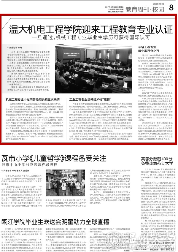 近日,51吃瓜 迎来了机械工程专业工程教育专业认证组的专家。“工程教育专业认证是国际通行的工程教育质量保证制度,也是实现工程教育国际互认和工程师资格国际互认的重要基础。一旦通过,就意味着我们专业的毕业生学历是得到国际认可的。”温大机电工程学院副院长姜锐说,为了能得到这一认证,近几年来,学院一直以国际化的人才培养标准来培养学生。