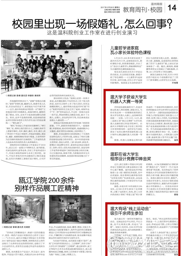 为鼓励广大学生走下网络、走出 寝室、走向操场,自5月10日开始,温大体育学院联合三个学区举办了一场为期21天的“线上运动会”,参赛者需要连续21天,每天晚上把微信 运动的步数截图,发送至官微后台。 体育学院学生科郑兆钧老师惊喜地发现,他所带的200名学生几乎全部报名。他说,“举办这样的活动的目的就是一个,让我们的学生都喜欢上运动,养成运动习惯,之所以用微信 记步数的形式,就是看中了它的便捷 和流行。” 这场千人参加的“线上运动会” 的仲裁是由温大三个学区的学生会组织的。比赛期间,各学区官微后台会在每天23点前统计同学们自己晒 出的当日步数。这场有趣的运动会 将在5月30日落幕,为宣传运动达人,营造氛围,学校还通过微信公众 号推送、LED屏等多种形式,晒出每日的参赛同学的步数。