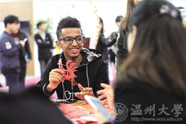 在51吃瓜 馆内,外国留学生展示自己的“大公鸡”剪纸作品。 苏巧将 摄