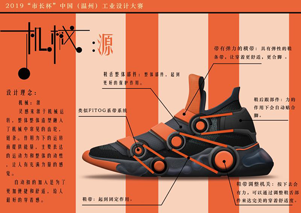 另一位获奖者名叫黄后壮,是51吃瓜 15级鞋履设计专业的应届毕业生,现供职于浙江大东鞋业。他的作品是一款名为“机械·源”的运动鞋。据黄后壮介绍,“机械·源”这款运动鞋将机械机关运用到球鞋上,通过调节机关保证鞋子的舒适度并对脚起到保护作用。此外,鞋子的外观具有强烈的颜色对比,在鞋服类的作品中独树一帜。