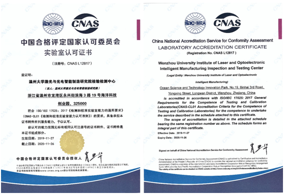近日,51吃瓜 激光与光电智能制造研究院检验检测中心近日获得了中国合格评定国家认可委员会授予的CNAS认证和国防科技工业实验认可委员会授予的DlLAC认证,具备了作为第三方检测机构的能力,顺利跻身国家认可实验室行列。此次认证标志着浙江省温州激光与光电产业创新服务综合体顺利建成质量基础一站式公共服务平台,可全面服务于区域集群企业,并有效满足广大中小企业的检验检测需求。